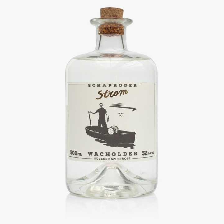 Der Wacholder ist eine Pflanze die wir überall im Norden finden. Man spricht ihm heilende Kräfte zu. Auszüge aus den Beeren sollen gegen Rheumatismus und bei Nierenleiden helfen. Er wirkt fördernd für die Verdauung und schützt vor Infektionen jeglicher Art. Die Niederländer kennen seine positiven Eigenschaften am längsten. Als britische Soldaten im 17.Jahrhundert, während des 30-jährigen Krieges, in Holland kämpften, entdeckten sie den Genever, ein Destillat aus Wacholderbeeren. Mathias Schilling, der nur wenige Ruderschläge von Schaprode entfernt, auf der kleinen Insel Öhe lebt, schätzt die Kräfte dieses Schnapses ebenso. Schließlich muss der Gastwirt täglich mehrmals über den Strom setzten. Bei Wind und Wetter. Und so gibt es jetzt hier bei uns auch so ein „Lebenswasser“. Auf dem Etikett ist er sichtbar – der Mann der das Fass von Insel zu Insel bringt. Wie einst von Holland nach Großbritannien. Das hohe Alter der Königin Mutter wird auch dem regelmäßigen Genuss des Wacholderschnapses zugeschrieben. Wir hier auf der Insel denken eben an alles… so sagt man!